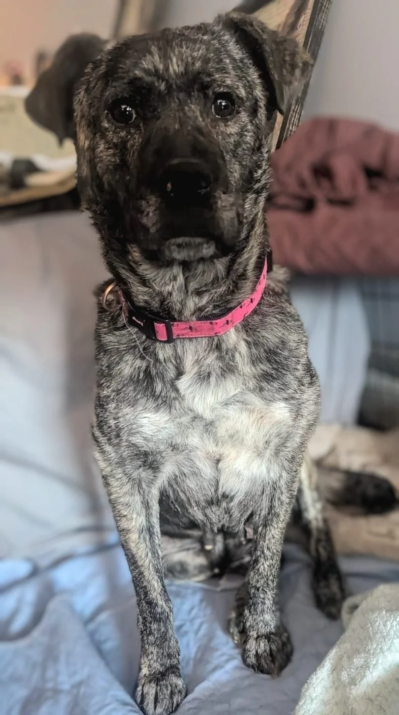 It is believed she had more puppies than the two who survived. Nova is very bonded to the puppies she raised and has experienced a lot of instability in her early life. Because of this, she can be timid and cautious around people, but she is gradually learning to trust and continues to make steady progress now that she is safe and supported.